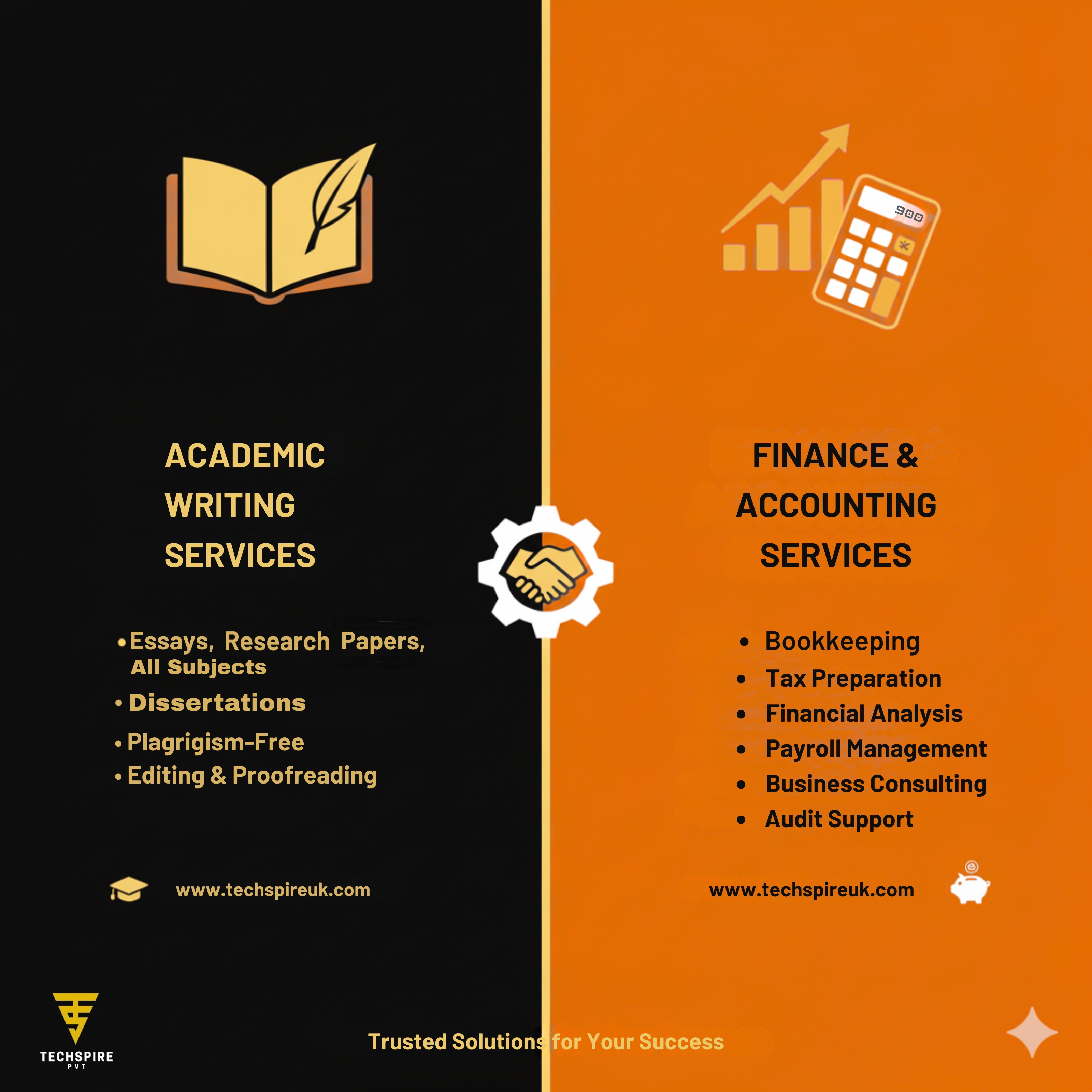 At TechSpire, we are committed to delivering exceptional services in two critical areas: Academic Research and Accounting & Finance. Our clients choose us because we provide reliable, expert-driven solutions tailored to their specific needs, always with a focus on accuracy, integrity, and results.